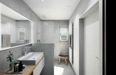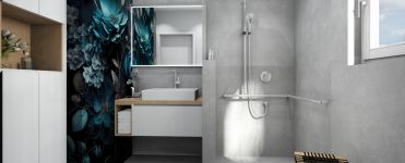 So entschieden wir uns bei der Planung für einen bodenebenen, gefliesten Duschbereich mit extra rutschhemmenden Fliesen. Dort kommt eine Unterputz-Thermostatarmatur zum Einsatz, die eine separate Kopfbrause sowie die Handbrause steuert. Der verchromte Handlauf läuft über Eck, um an jeder Stelle einen sicheren Halt gewährleisten zu können. Die Trennwand zum Waschtisch wurde halb hoch ausgeführt, darüber Glas um das sehr kleine Bad nicht noch mehr einzuengen. Ein großer Leuchtspiegel lässt den raum ebenfalls großzügiger wirken.