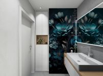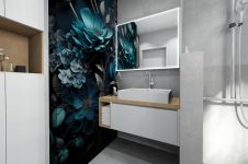Das tiefe Aufsatzbecken mit einer Armatur zum Ausziehen ermöglicht bequemes Haarewaschen am Becken. Hier wäre auch ein rollstuhlgerechter Umbau umsetzbar. Hierfür müsste lediglich der Unterschrank am Waschtisch entfernt werden. Neben dem Waschbecken wertet ein Wandbild das ansonsten sehr neutral gehaltene Badezimmer zusätzlich auf. Der daneben befindliche Hochschrank wurde auf Maß für die Nische gefertigt, mit einer umlaufender Passblende versehen und bietet so reichlich Stauraum.