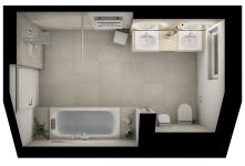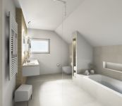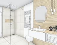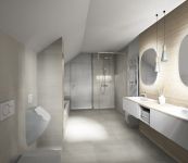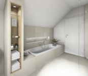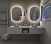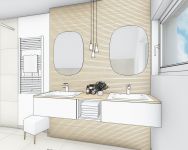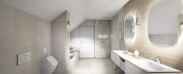 Der elegante Doppelwaschtisch wurde als Einbau-Mineralgusswaschbecken umgesetzt. Durch die ebenfalls beleuchteten und dimmbaren Wandnischen in der Dusche und Badewanne sowie den zwei Leuchtspiegeln am Waschtisch, entsteht eine gemütliche Atmosphäre zum Baden.