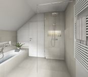 Die Acryl-Badewanne mit einer Ablagefläche und der großer Wandnische wurde eingemauert und mit Fliesen verkleidet. Ein Walk-in Duschbereich, bodeneben gefliest und mit Duschrinne und Duschsystem inkl. Kopfbrause und Thermostat ausgestattet, befindet sich direkt neben der Zugangstür und wurde mit einer Glasscheibe abgetrennt.